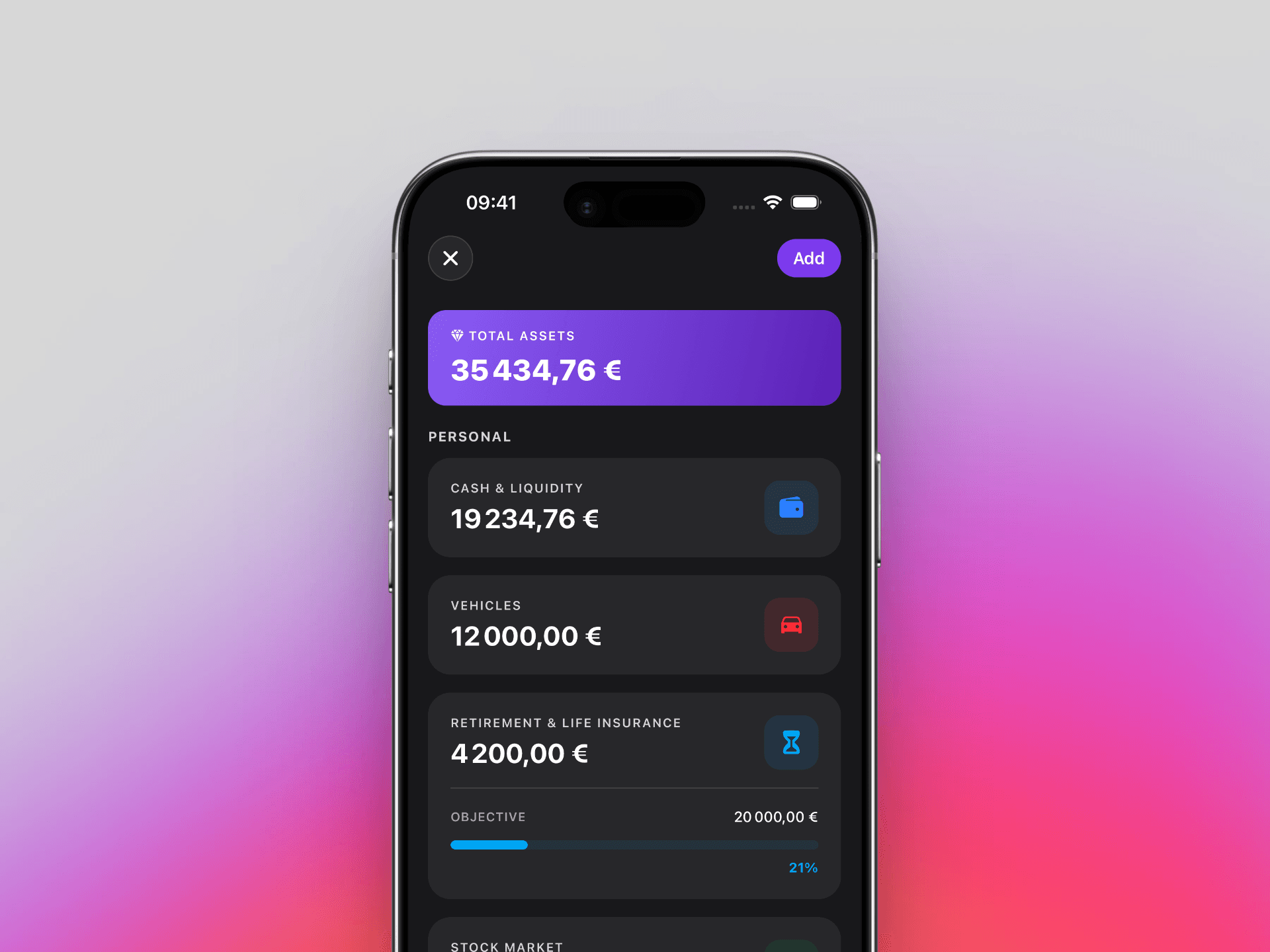 Suis l'évolution de tout ton patrimoine au même endroit : immobilier, épargne, crypto, actions, véhicules. Une vue globale de ta situation financière.